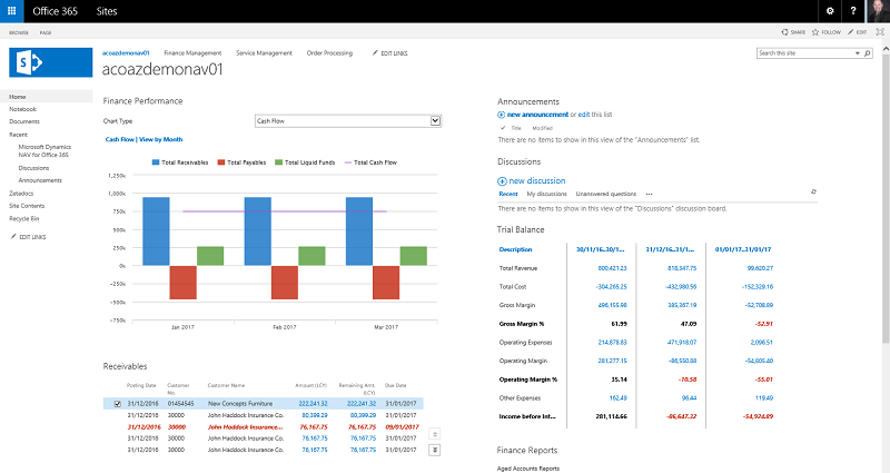 In addition to storing all your files on SharePoint you can also present data using other business applications. See a screenshot below of some data from Microsoft Dynamics NAV embedded in SharePoint:
