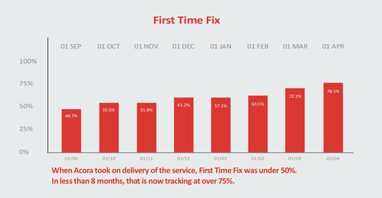 As shown by the graph below, the increase in First Time Fix and Service Desk resolution clearly reflects the successful work from Acora, but also of the wider CrippsPG IT ecosystem.